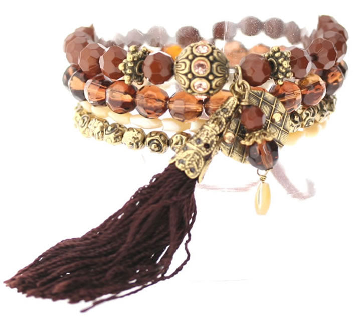 Quad Elasticated Bracelet from the 'Ethnic Dream' Collection in Brown/Peach/Gold with a glorious 85mm tassel drop