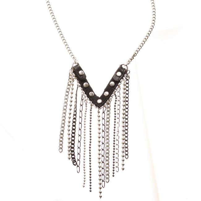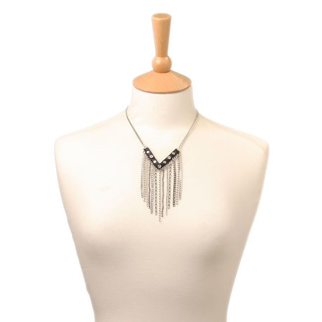 Metallic Fringe Pendant with leather, chains and Swarovski Crystals. The drop at the centre measures 10cm (4inches) . Adjustable chain 470-530mm (18.5-21 inches) Black/Silver