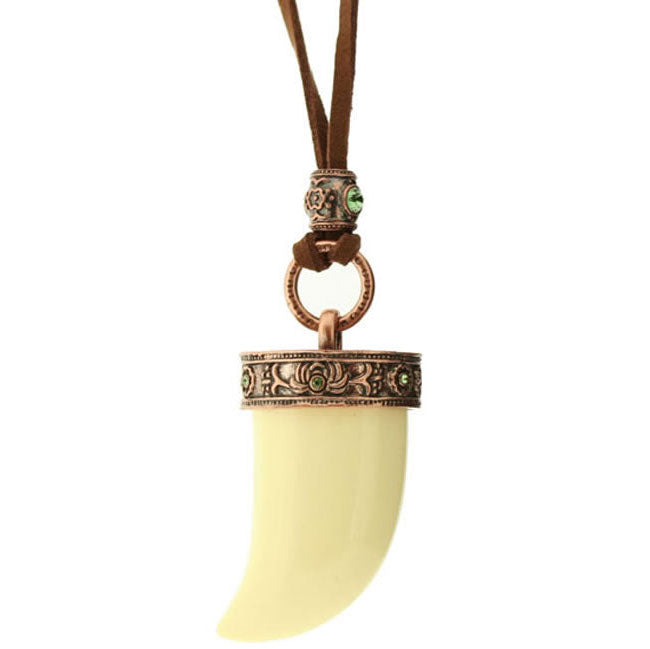 Impresive necklace from the Zanzibar collection on a faux suede thong in mint/copper. The tusk measures 47mm long This is a mid length necklace shown on the neck in the enlargement but hangs much lower adjustable 780-860mm