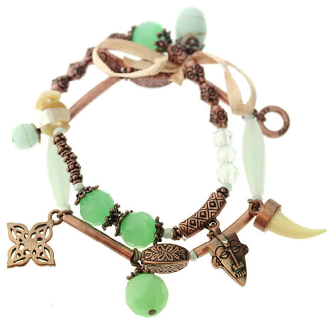 Twin elasticated charm bracelet from the Zanzibar collection. Two bracelets tied together with ribbon. Mint/Copper