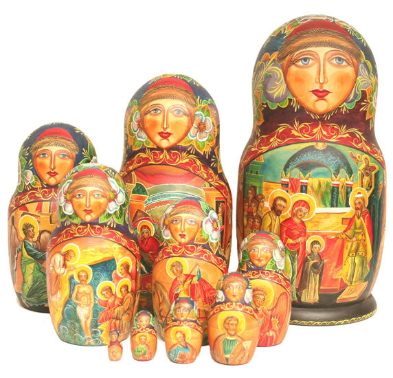 A religious set painted in acrylic with a matt finish with a wonderful transulcent sheen 230mm 10 Piece