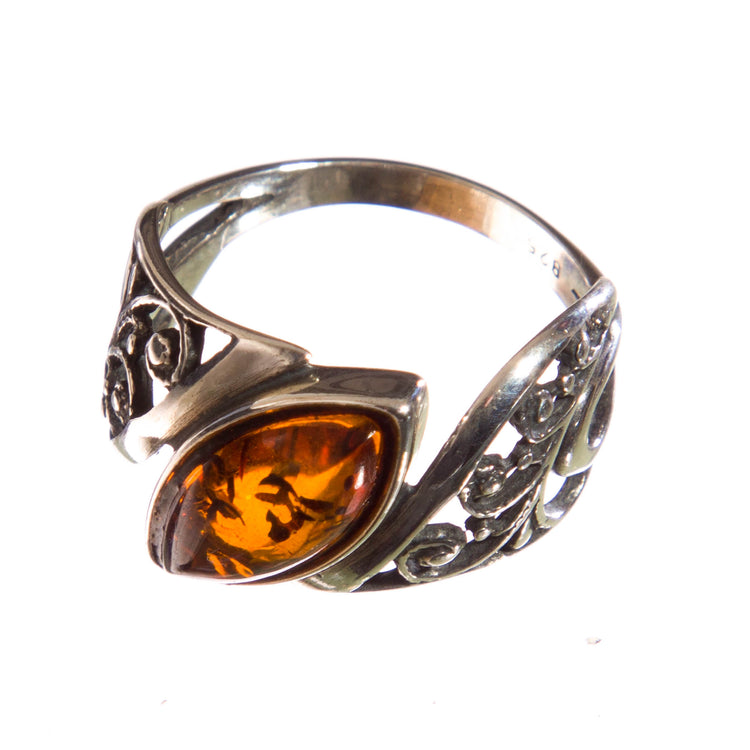 Exquisitely crafted from 925 sterling silver and featuring a gorgeous amber stone, this ornate ring is a true work of art, weighing in at a delicate 3 grams.