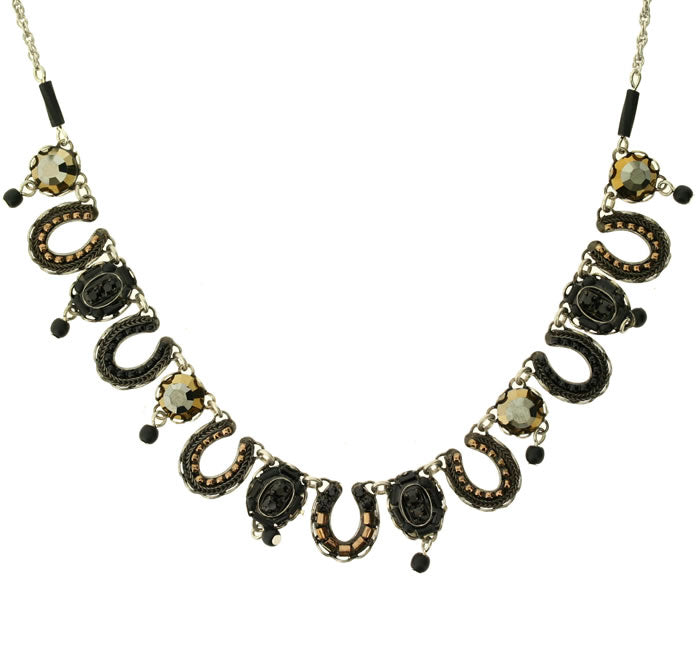 Very pretty, all-around necklace from the Savoy collection. Each horseshoe-shaped element measures 14x10mm, chain 380-480mm. Black/gold/silver colourway