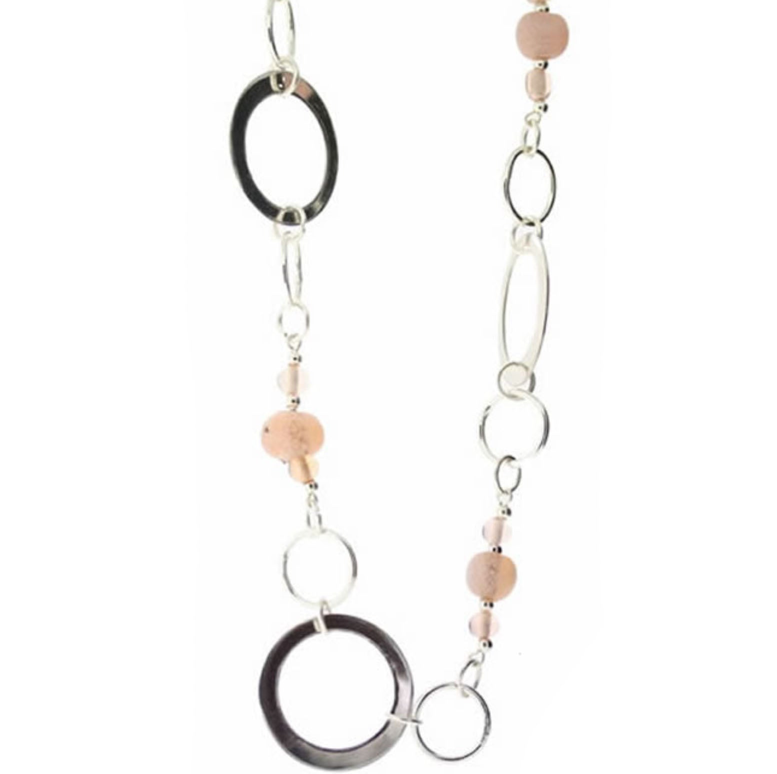 Long Necklace made from hoops and stones.850mm long, largest hoops measure 35mm across. Silver Plated