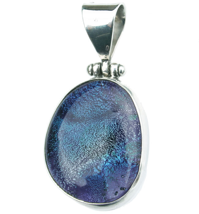 Dichroic glass in sterling silver. Pendant measures 28x22mm Total drop is 47mm Expertly crafted with dichroic glass, set in exquisite sterling silver. Offering elegance and style with every wear, this pendant measures 28x22mm and boasts a total drop of 47mm.