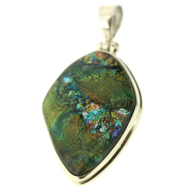 Dichroic glass in sterling silver. Pendant measures 35x25mm