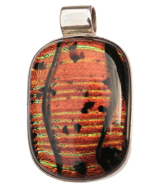 Dichroic glass in sterling silver. Pendant measures 28x19mm, 35mm drop