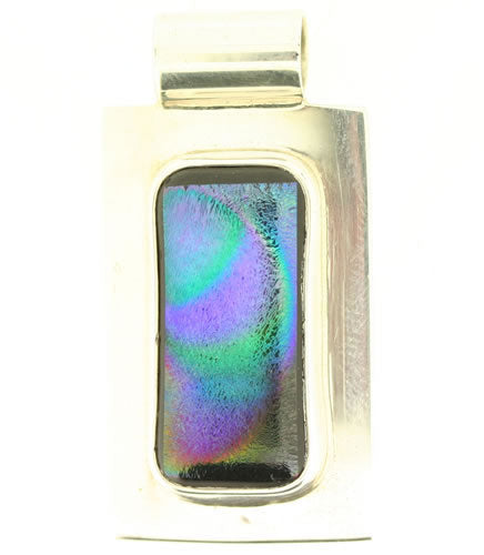 Dichroic glass pendant set in sterling silver. Setting measures 24x38mm, Glass measures 13x27mm.