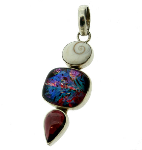 Dichroic Glass, garnet and Shiva Eye shell pendant total drop 65mm glass measures (20x17mm)