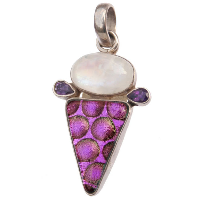 Dichroic Glass triangle with moonstone oval and amethyst teardrops. Total drop 55mm, 27mm max width