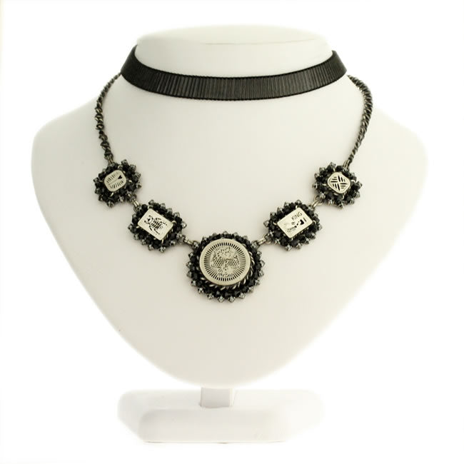 Necklace with a detatchable stetchy organza Choker from the Sinners and Saints Collection, The centre disk measures 3cm (1.25 inch) diameter. Adjustable Chain 41.-49cm (16 - 19 inches) Crystal/Silver