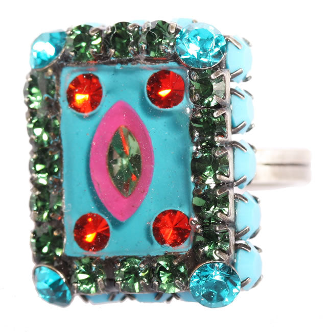 Spectacular Crystal Adjustable Ring, from the Sourvenir D' Afrique collection 24x20mm (1x1.75inch wide) Turquoise/Multi/Silver