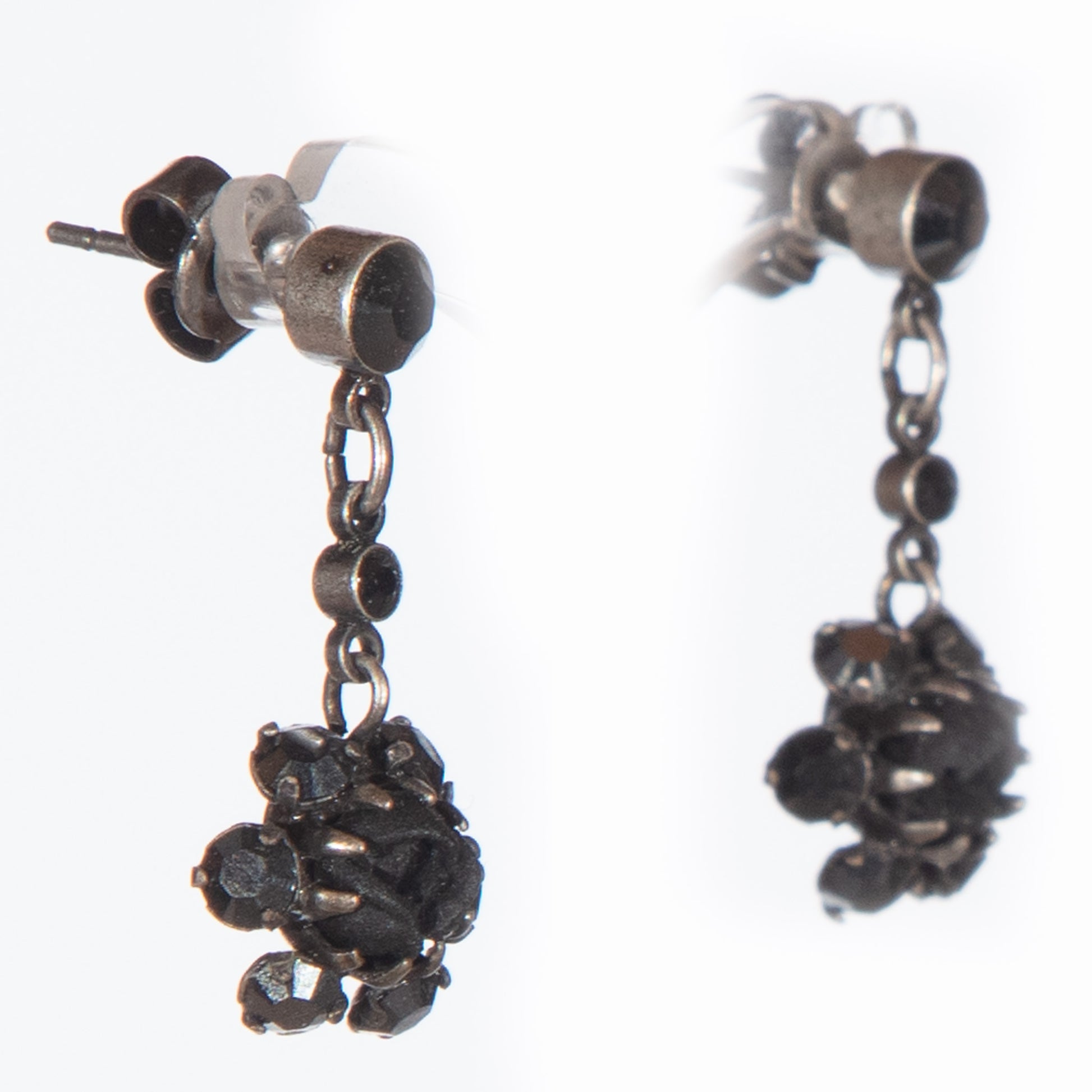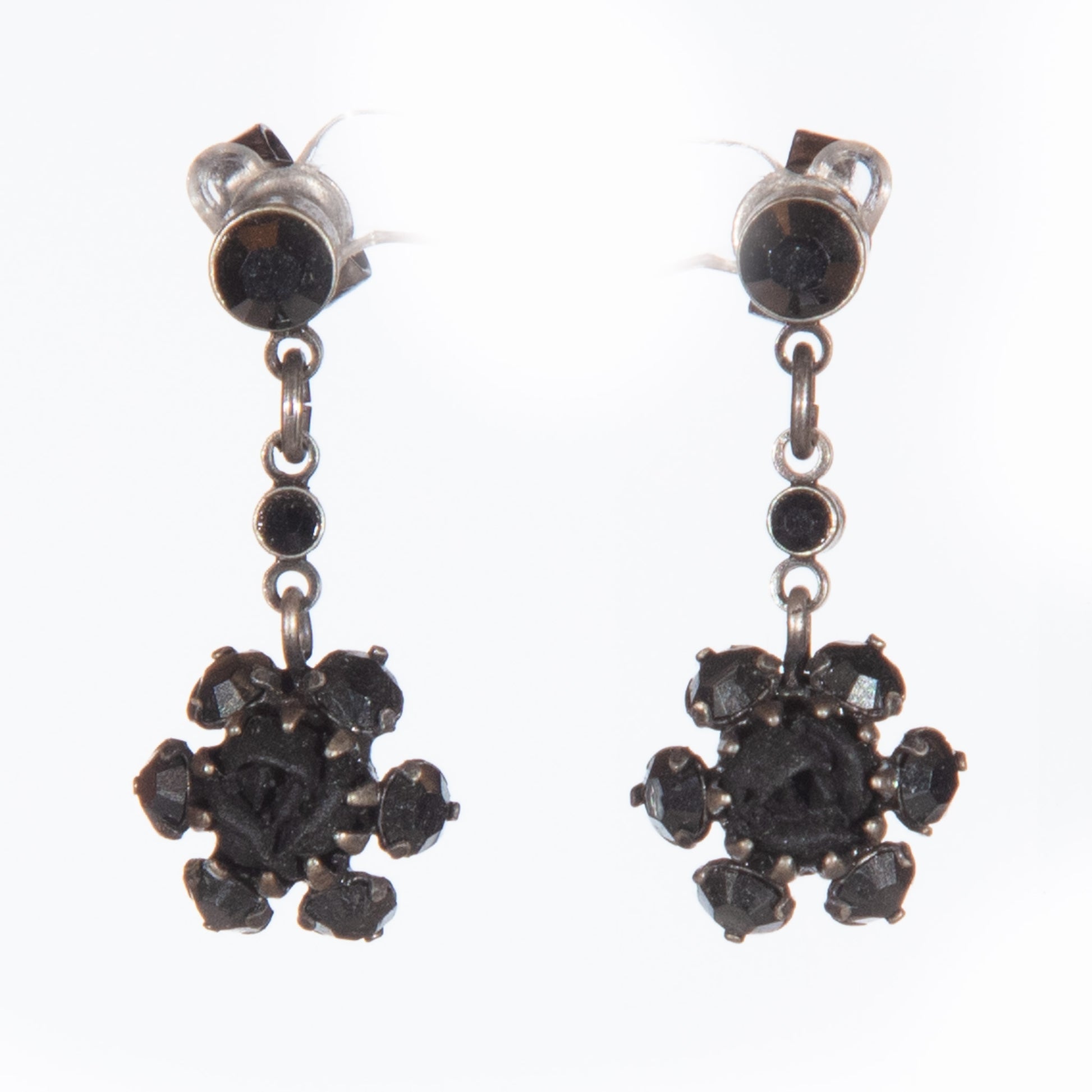 These elegant vintage stud-drop earrings feature a compact floral cluster design with a beautifully textured black centre, surrounded by faceted black Swarovski crystals that add subtle depth and sparkle.