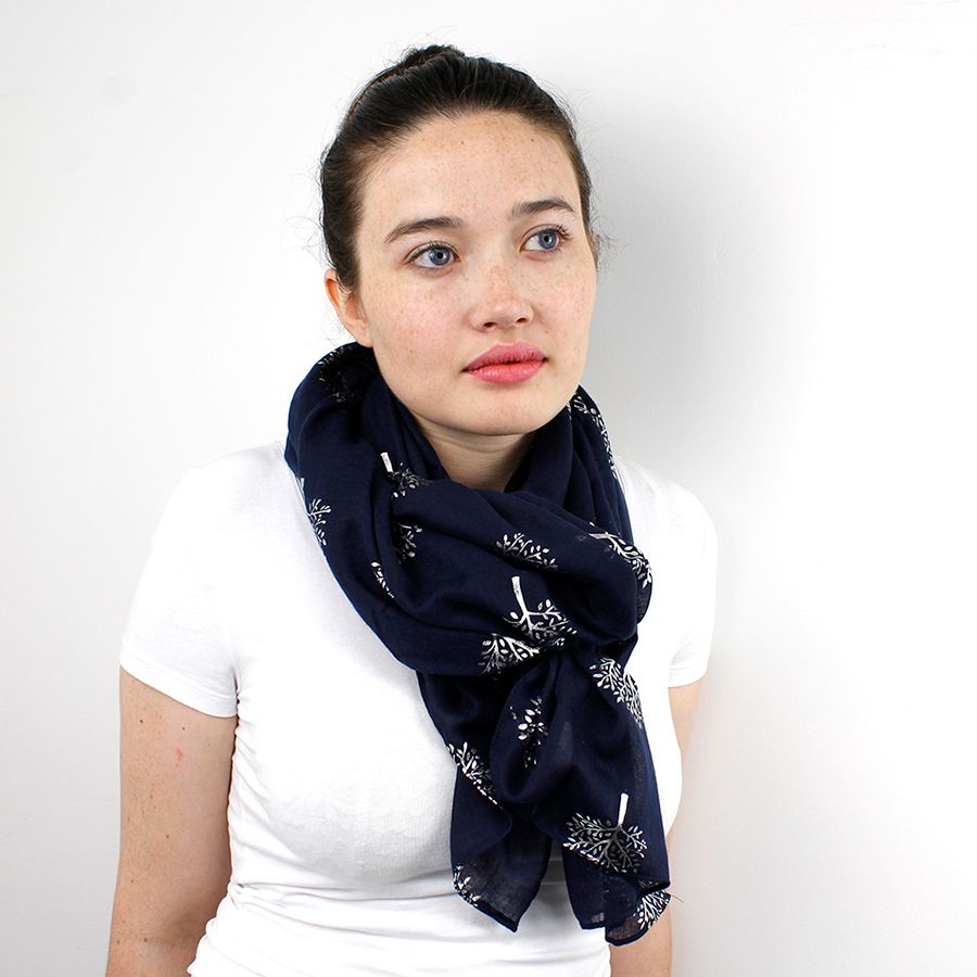Navy Scarf With Silver Tree Print By POM