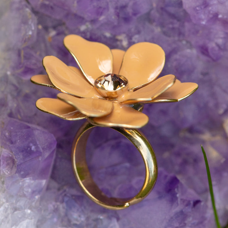 Ring from the 3D Flower collection with a Swarovski crystal in the centre. Enamel Petals in Peach/Gold Adjustable Size Flower 32mm diameter