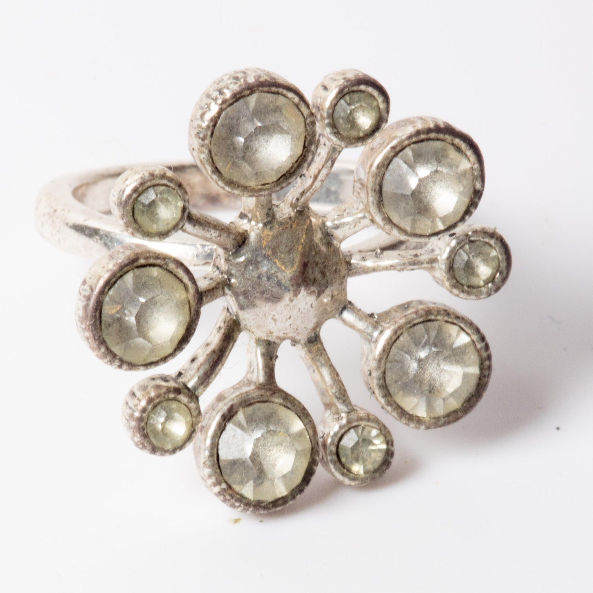 The raised, arm-like settings create a strong three-dimensional form, giving the ring depth, movement, and architectural presence. The cool silver-tone finish enhances the clarity and sparkle of the crystals, while the clustered layout emphasises volume and structure over delicacy.