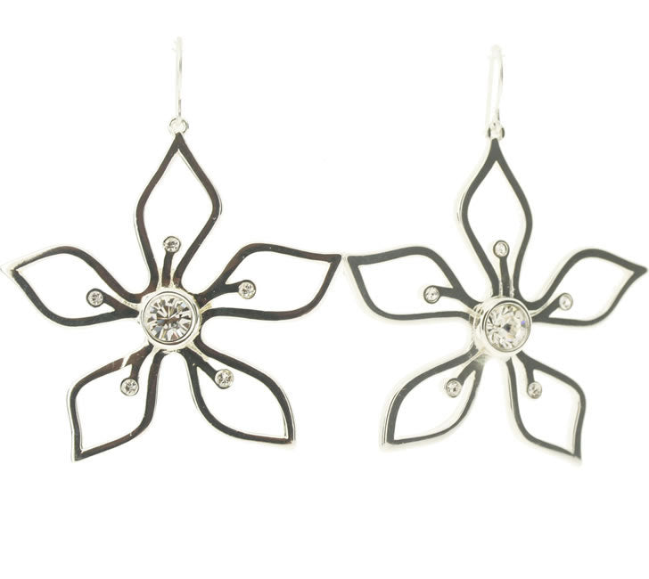 Large hook drop earrings, a flower with a Swarovski crystal center. 45mm drop from hook.Silver colour way.