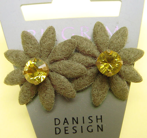 Green/Gold Felt flower earrings, the centers are beautful Swarovski crystals 18mm across flower