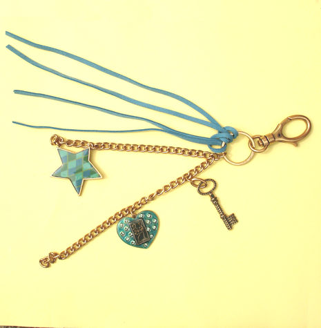 Key, star and heart bag charm/ keychain. In Turqoise/Gold. 300mm long. Looks good hanging from a belt loop or your hand bag. Suede tassles and two gold chains with charms