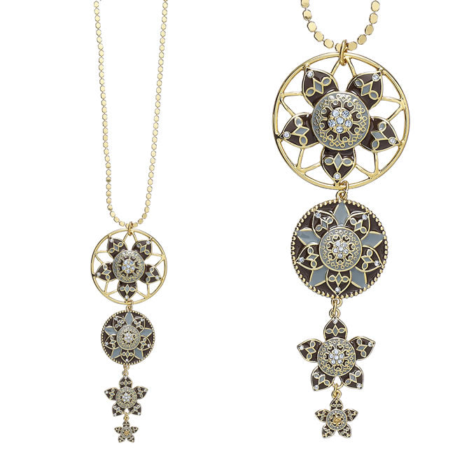 An impressive Quad Drop Necklace from the Legend collection, 13.5cm (5.25 inch) drop. Adjustable chain 38 - 46cm (15 -18 inches) Blue/Brown/Gold.