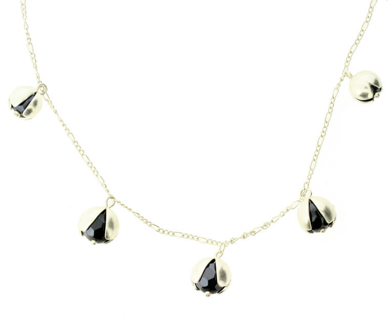 Allround necklace with five faceted seeds all bursting from their pods. Adjustable 350-430mm, 17mm drop. Black/silver colourway.