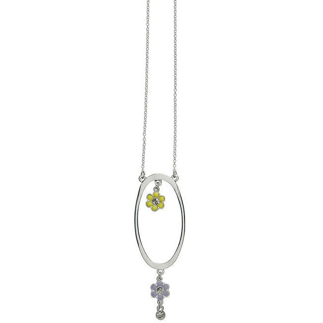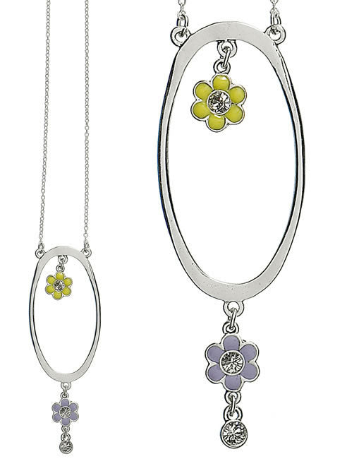 Hoop pendant with dangling flowers, 75mm drop from chain, adjustable 375-455mm. Pastel/Silver colourway