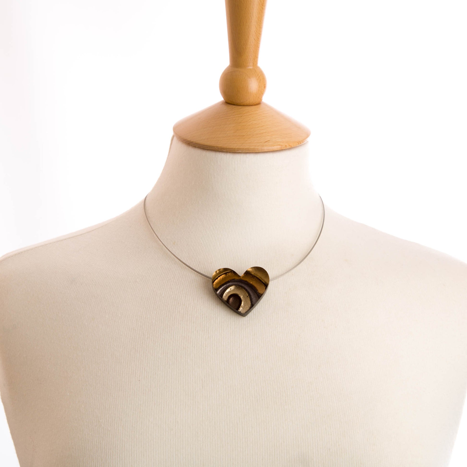 Heart Necklace from the Linear Hearts Collection, the heart measures 40 x 35mm (1.5 x 1.25 inch). Adjustable length 42-46cm (16.5-18 inches), Brown/Gold/Silver colourway